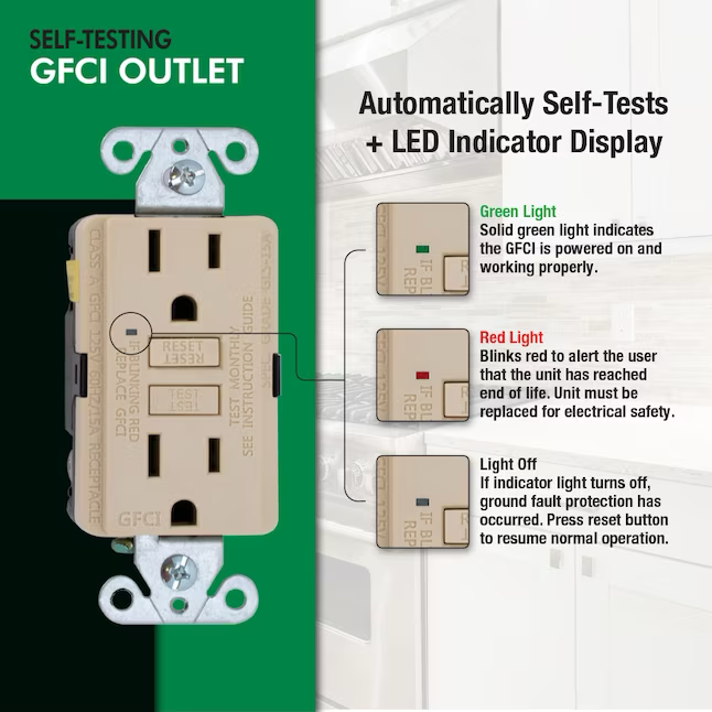 The EZ-FLO 15 Amp self-testing ground fault circuit interrupter outlet provides continuous protection from ground faults. The receptacle will disconnect power in 1/40 of a second if a dangerous condition is detected. Once connected to power this GFCI receptacle automatically self-tests every 2-1/2 hours giving you peace of mind. The LED Indicator display has 3 light indicators – (Green) GFCI is powered on and working properly,(Red) Blinks to alert you the unit has reached its end of life and needs to be replaced, (OFF) light turns off if the outlet is not receiving power or a ground fault protection has occurred for your safety. With a new slimmer design and capability for back and side wire, EZ-FLO receptacles are easy to install. An installation manual and wall plate are included in each package.
