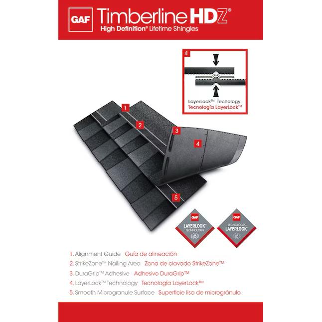 Proprietary LayerLock™ Technology mechanically fastens the common bond, allowing for a larger nailing area, up to 600% larger nailing target(compared to Timberline HD® Shingles)