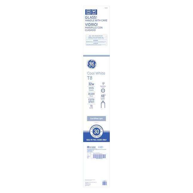 - Specifications 3 Way No Motion Sensor(s) Included No Battery Back-Up No Package Quantity 30 Blacklight No Package Type Multi-pack Built-In Speakers No Plug-In Type Medium bi-pin Bulb Material Glass Primary Usage Light fixtures Bulb Shape Linear Rapid Start Yes Bulb Shape Code T8 Rated Life (Hours) 30000.0 Bulb Type Fluorescent Remote Control Included No Dimmable No Scheduling Ability No Dusk-to-Dawn Sensor No Shatter Resistant Yes Edison No Tube Length (Inches) 48 Enclosed Fixture Rated Yes Tube Type Type A Energy Efficient Yes Usage Rating Damp rated Filament Style N/A Use Location Indoor Grade Commercial/Residential Vintage No Hub Required No Voice Controlled No Light Bulb Base Type Medium bi-pin (T8) Volts 120 Wattage 32 Lumens 2975 Wattage Equivalent 32