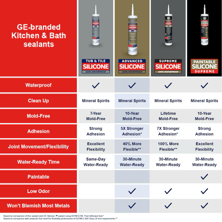 Excellent for sealing a wide range of kitchen and bath projects such as sinks, tubs, showers, fixtures, countertops, backsplashes and additional plumbing applications