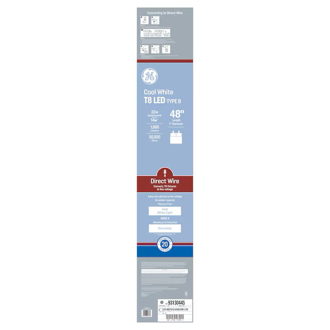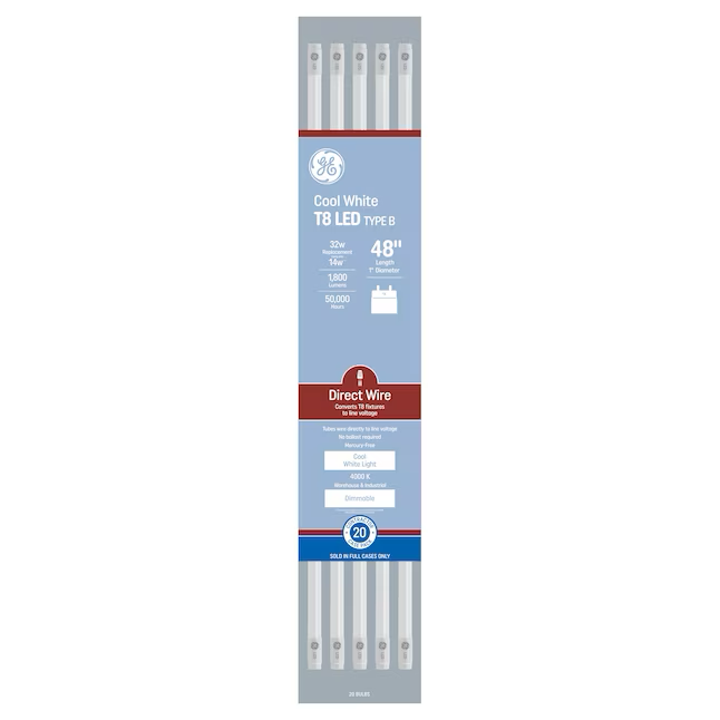 - Features 3 Way No Motion Sensor(s) Included No Battery Back-Up No Package Quantity 20 Blacklight No Package Type Multi-pack Built-In Speakers No Plug-In Type Medium bi-pin Bulb Material Glass Primary Usage Light fixtures Bulb Shape Linear Rapid Start No Bulb Shape Code T8 Rated Life (Hours) 50000 Bulb Type LED Remote Control Included No Dimmable Yes Scheduling Ability No Dusk-to-Dawn Sensor No Shatter Resistant No Edison No Tube Length (Inches) 48 Enclosed Fixture Rated Yes Tube Type Type B Energy Efficient Yes Usage Rating Damp rated Filament Style N/A Use Location Indoor Grade Commercial/Residential Vintage No Hub Required No Voice Controlled No Light Bulb Base Type G13 Volts 120 Wattage 14 Lumens 1800 Wattage Equivalent 32