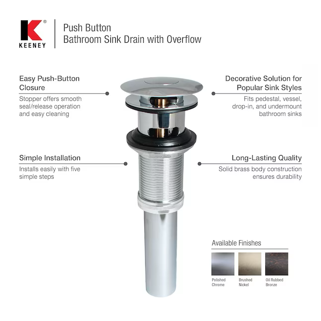 Fits popular bathroom sink styles: pedestal, vessel, drop-in, under-mount