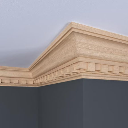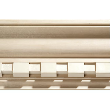 Crown moulding is the most recognized architectural feature that can add value to your space! Crown your home with elegant solid hardwood! Our 4-1/2 inch wide dentil crown moulding has a classic design to accent almost any room. The crisply cut dentil insert creates beautiful depth and shadowing and adds sophisticated architectural detail wherever this moulding is installed. Deeply rooted in traditional architecture, this dentil moulding is sure to transform your interior space. Also available are matching 710 and 1710 chair rail mouldings.
