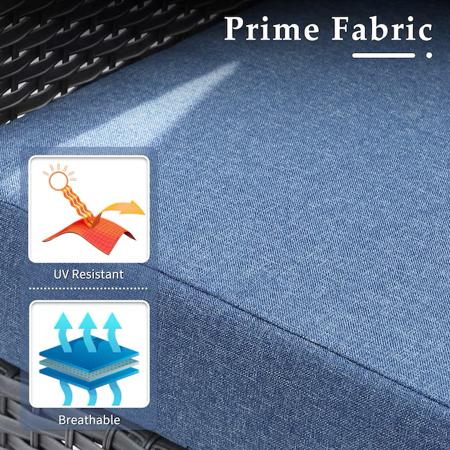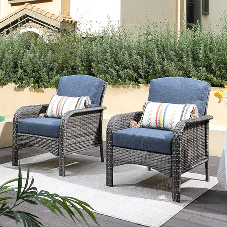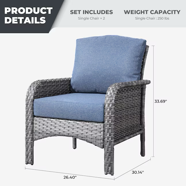 Ovios Set of 2 Wicker Black Metal Frame Stationary Conversation Chair with Blue Cushioned Seat