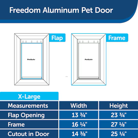 • Specifications Application Entry door Pet Door Size (W x H) 16-1/8-in x 27-1/2-in Pet Type Dog/Cat Material Aluminum Rough Opening 25.25-in x 14.375-in Passage Opening (W x H) 13-3/4-in x 23-3/4-in Use Location Exterior