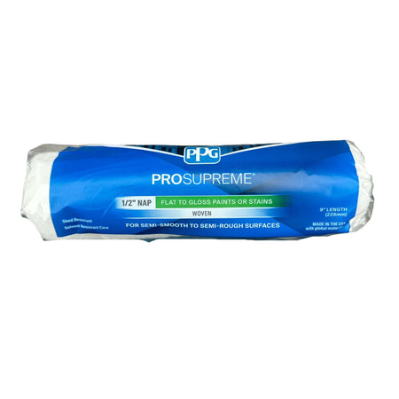 Enhance your painting experience with the PPG ProSupreme Woven 1/2 in. NAP x 9 in. L Roller Cover. Made of high quality materials, this roller cover ensures smooth and even paint application, saving you time and effort. Its 1/2 inch nap and 9 inch length guarantee maximum coverage and efficiency.