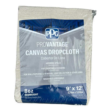 Protect your floors and furniture during painting projects with the PPG ProVantage Canvas Drop Cloth. Made with midweight 8oz canvas, it offers durable and reliable protection. Measuring 9ft x 12ft, it provides ample coverage for any size project. Keep your space clean and your mind at ease with this high-quality drop cloth.