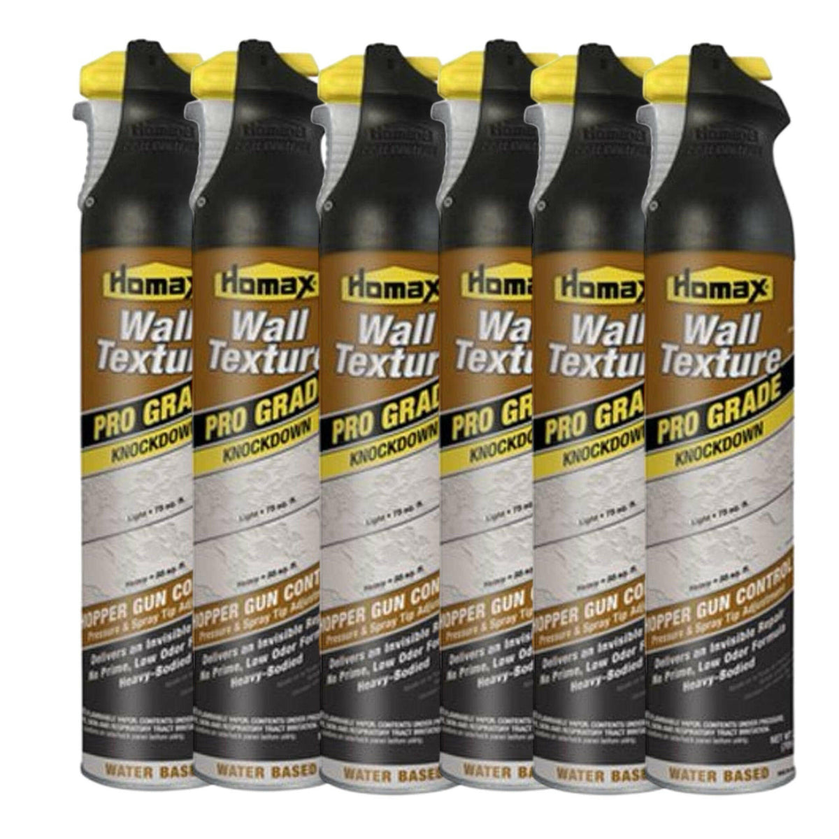 Homax pro grade, 25 Oz, knockdown, water based, wall texture spray paint with dual control, features adjustment of both pressure and pattern which makes this convenient and simple to use, no mixing or using a compressor, heavy bodied knockdown formula is tinted for improved visibility during application, simply spray, knock down with A mud knife and paint to achieve an invisible repair, low odor, easy clean up, no prime, coverage up to 75 Sq. Ft.
