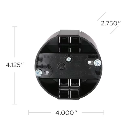 RACO saddle box is 4 in. round and 2-39/64 in. deep. The saddle box is made of heavy duty engineered polycarbonate plastic. The box is recommended for earthquake areas. Designed to accommodate 1/2 in. drywall.
