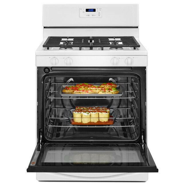 Enjoy the flexibility and efficiency you need to prepare holiday meals and everything in between with this 5.1 cu. ft. capacity freestanding gas range. Toasting a large batch of garlic bread or melting cheese on burgers for the whole family is easy with the full-width under-oven broiler, which provides enough space to broil an entire rack of food. Multiple Power™ burners with up to 15,000 BTUs are perfect for high heat tasks like searing and frying, while continuous, satin-finish cast-iron grates let you slide heavy pots and pans to the optimal cooking location. The upswept, porcelain SpillGuard™ cooktop contains spills for easy cleanup. Plus, you can monitor cooking progress without opening the door and disturbing the oven temperature with the large oven window.