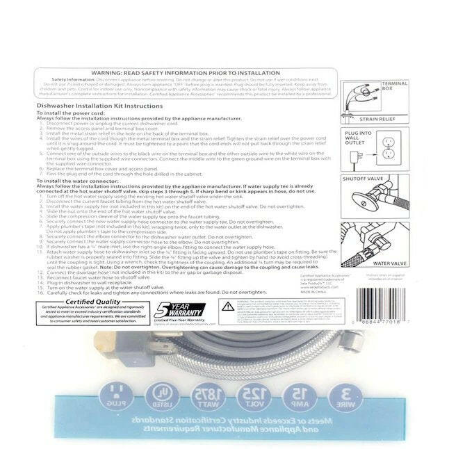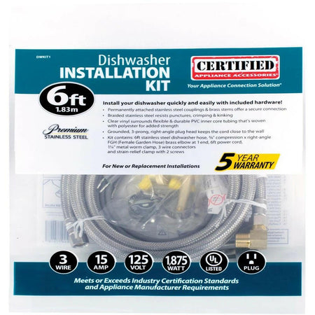 For years, licensed plumbers, electricians and appliance installers have relied on Certified Appliance Accessories for their power cords, hoses and connectors. Now you can too. Enjoy the convenience offered by this dishwasher installation kit from Certified Appliance Accessories. This high-quality kit includes a power cord, water hose and other accessories to ensure a flexible and reliable connection for your next home installation project. This kit’s components have been thoroughly tested and are backed by a 5-year limited warranty. Follow our illustrated, step-by-step directions included in the packaging. Always consult your appliance’s installation instructions. Check your appliance's manual for the correct specifications to ensure this kit is right for you. Thank you for choosing Certified Appliance Accessories—Your Appliance Connection Solution.