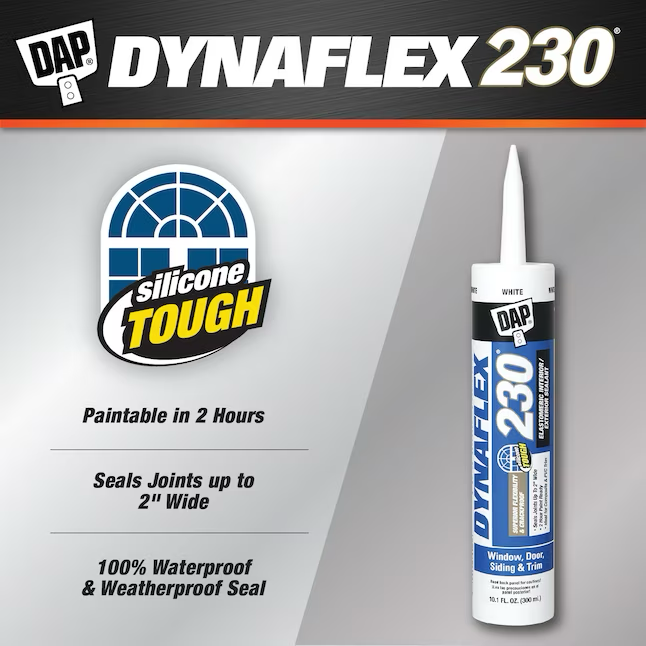 DAP® DYNAFLEX 230® 100% waterproof window, door, siding and trim sealant is a premium Elastomeric sealant with silicone like toughness to withstand the elements. Combines outstanding durability, adhesion and flexibility with easy tooling, paint ability, low odor and water clean-up. Highly flexible to handle joint movement without cracking, crumbling or losing adhesion. Ideal for sealing around window and door frames, siding and trim both inside and out.