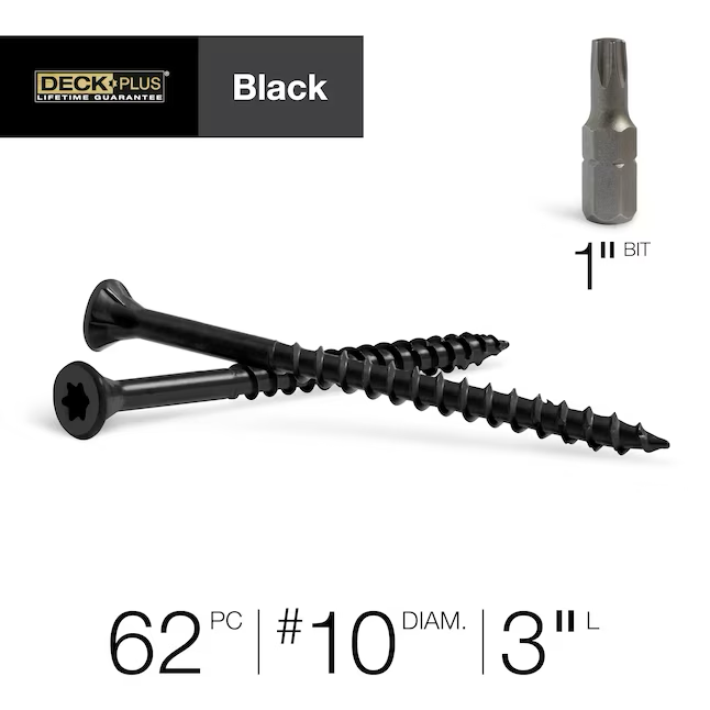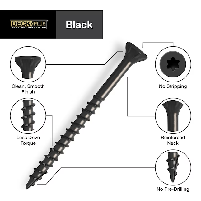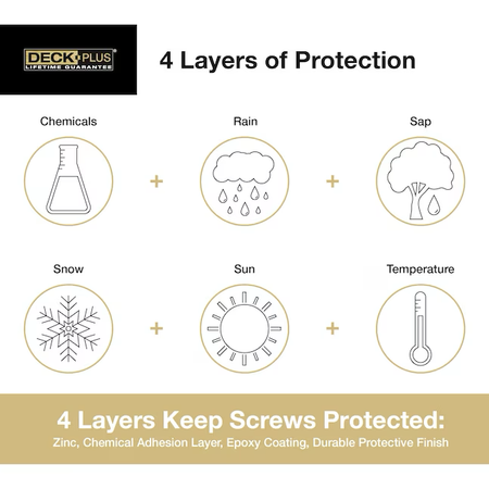 Deck Plus Wood and Fence Screws were designed to provide superior weather protection that matches the finish of your deck. Countersinking nibs under the head of the screw cut a perfect finished hole by transporting wood fibers out and sealing the surface. The epoxy coating provides superior rust and corrosion resistance with 4 layers of protection - a zinc layer, a chemical adhesion layer, an epoxy coating, and a durable protective finish.