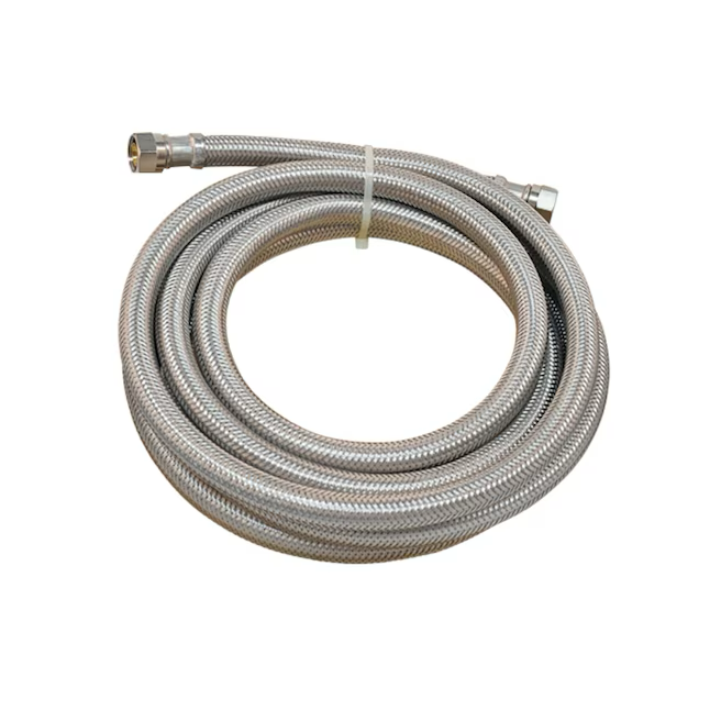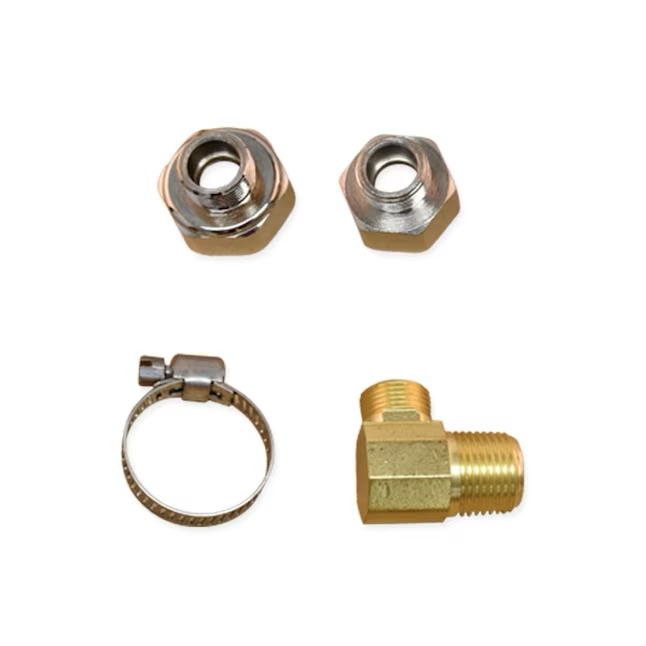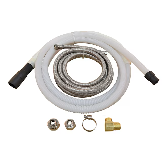 Includes: (1) 10-Ft braided stainless steel water supply line, (1) 10-Ft white corrugated discharge hose, (1) 1/2-In comp valve adapter, (1) 1/2-In FIP valve adapter, (1) 3/8-In MIP elbow, (1) stainless steel hose clamp