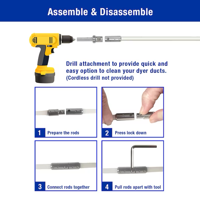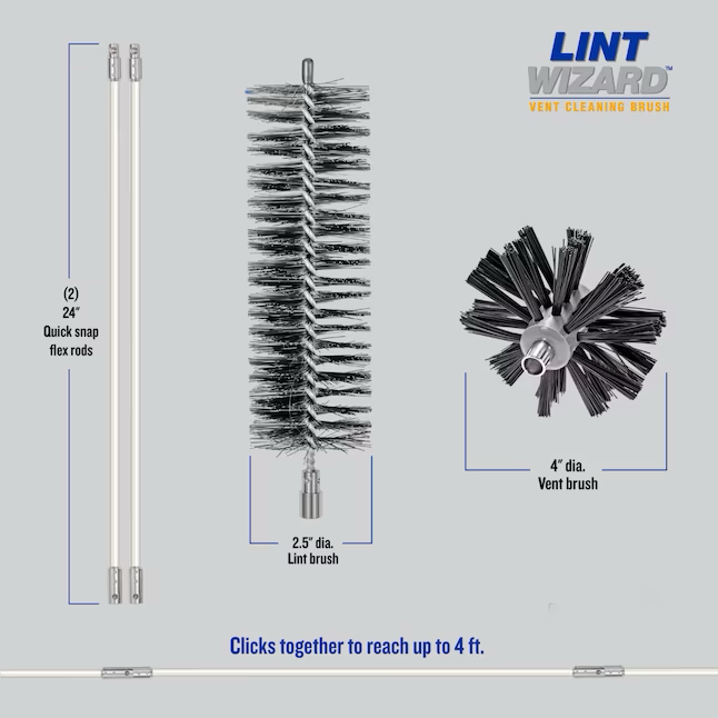 Includes (2) 2-ft long flexible quick-snap rods, (1) self-feeding 4-in auger brush, (1) 2-1/2-in diameter lint trap brush