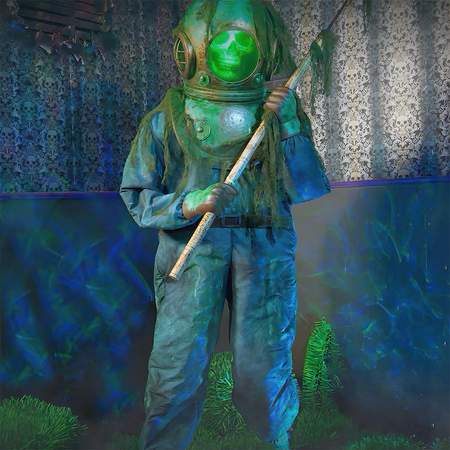 • IT came from the bottom of the deep dark sea…to terrify the company! Life-size Animated Haunted Deep Sea Diver includes elaborate steampunk diving suit with harpoon gun and seaweed details, LED lights and cinematic sounds.