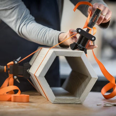 Pony style 1225 15 Ft. rapid acting band clamp is useful for awkward or irregular shaped clamping projects. Clamp a variety of odd shapes; round, polygon or square. Features: 1 In. x 15 Ft. nylon band, plastic non-marring 1 In. x 1 In. jaws allow for great fit on corners when gluing-up, metal levers allow for rapid adjustment/Release and large comfortable plastic handle. Load limit is 1,000 lbs.