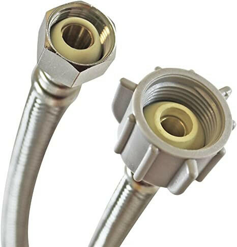 The Steel-Flex toilet connector by Eastman® features a 3/8-inch compression x 7/8 in. ballcock nut connection. It is built to last with a high-quality non-toxic PVC core, a multi-filament braided nylon reinforcement, a clear vinyl outer shell and a grade 304-braided stainless steel exterior that is designed to prevent kinking and crimping. This secure toilet supply line connector is equipped with full flow brass barbs and a chrome-plated solid brass ballcock nut. This professional series toilet connector is 12-inches long. The flexible braided stainless steel allows for easy installation in tight spaces. UPC approved. NSF and CSA certified. Complies with Lead-Free law.