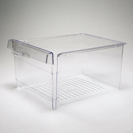 Whirlpool OEM W10804447 Refrigerator Crisper Drawer. This crisper drawer is clear in colour. The crisper drawer stores fruits and vegetables at a humidity level that helps keep them fresh longer. 14-1/2" x 11" x 7-1/2"