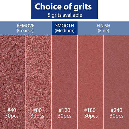 Assorted Grits - It consists of 150 pieces of sanding pads, including 40/80/120/180/240 grit, 30 sheets of each. Hence, the huge assortment makes it possible to satisfy your diversified needs. Besides, the availability of the grit name on the backing ensures easy identification.