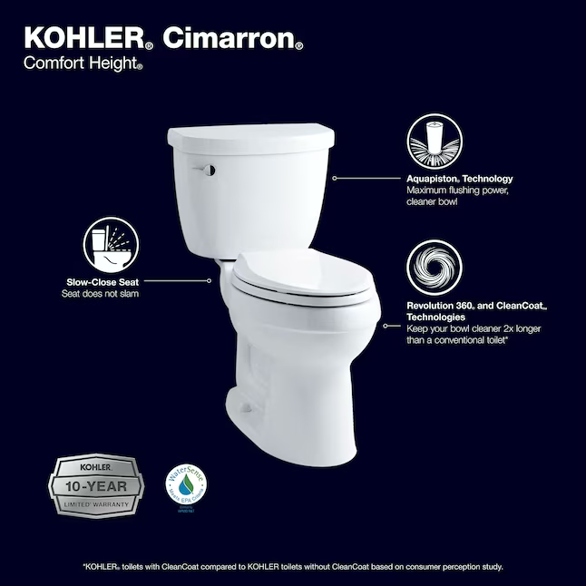 KOHLER Item # 21223905 | Model # 31678-0KOHLER Cimarron - Inodoro redondo blanco con altura de silla, 2 piezas, WaterSense, cierre suave, 12 pulgadas, empotrable, 1,28 GPF