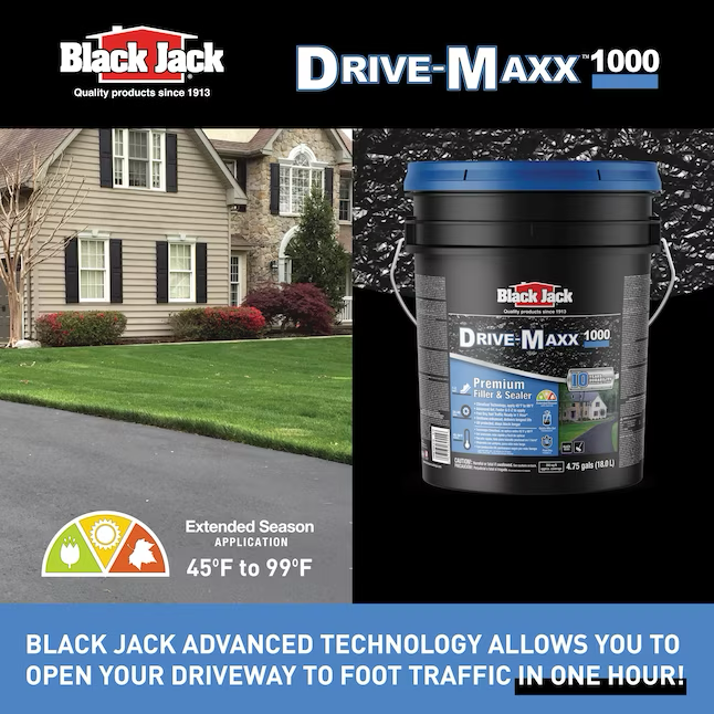 Mejorado con un polímero de látex para brindar el máximo rendimiento, una durabilidad inigualable y el mejor acabado, BLACK JACK® Drive-Maxx™ 1000 es el relleno y sellador de caucho de mejor calidad diseñado para pavimentos asfálticos. DriveMaxx™ 1000 también está formulado con una combinación de gel y tecnología Fast Dry para una instalación rápida y sencilla, además de la capacidad de abrir su entrada al tráfico peatonal más rápido. En condiciones normales de secado (temperaturas superiores a 75 °F, cielos despejados y soleados y humedad inferior al 35%), este sellador de caminos de entrada puede estar abierto al tránsito peatonal en solo una hora después de la aplicación. Para el tráfico de vehículos, debe esperar 24 horas para que el producto cure por completo.