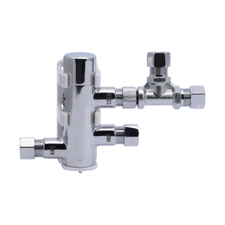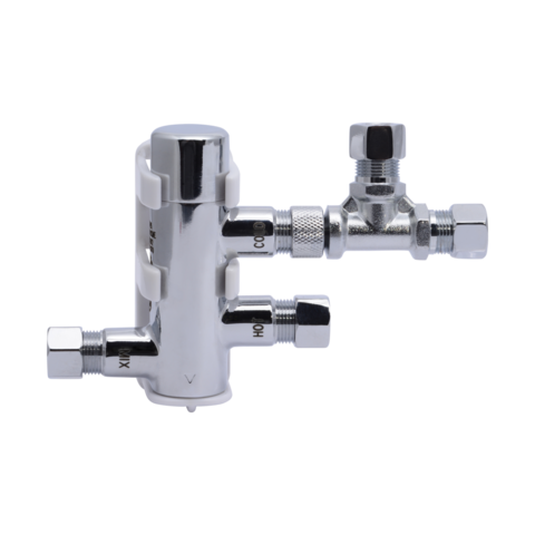 La HG135 es una válvula mezcladora de temperatura debajo del fregadero elegante y compacta diseñada para ayudar a prevenir quemaduras. Cumple con los estándares ASSE 1070 para válvulas mezcladoras y cuenta con un elemento termostático superior de acción rápida que proporciona un funcionamiento estable a caudales tan bajos como 0,25 gpm (0,95 lpm). La válvula anti-escaldaduras debajo del fregadero también reduce el flujo de salida a un goteo en caso de una falla en el suministro de agua fría para evitar quemaduras. Las entradas y conexiones de salida de la válvula de templado de agua caliente HG135 son estándar de 3/8 pulg. Conexiones de compresión de la línea de suministro para uso con tubo de 3/8 pulg. Las entradas cuentan con válvulas de retención para evitar la contaminación cruzada, así como tamices de filtro útiles para evitar que la válvula se obstruya con suciedad o residuos. La HG135 está disponible en dos variaciones que permiten instalarla como válvula mezcladora debajo del fregadero para grifos con sensor o grifos manuales de dos manijas, según sea necesario. Cada válvula mezcladora de temperatura HG135 incluye un soporte de montaje especialmente diseñado y accesorios para sujetar de forma segura la válvula. Al muro. El diseño compacto y la estética agradable permiten que nuestra válvula mezcladora para debajo del fregadero encaje perfectamente debajo o detrás de un solo lavabo. De conformidad con los estándares ASSE 1070, el rango de temperatura de salida ajustado del HG135 es de 100 a 120 °F (38 a 49 °C). )