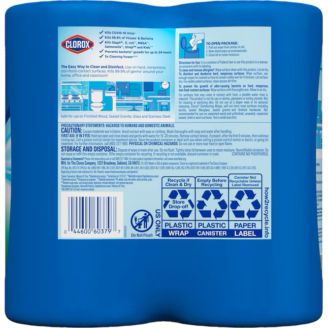 TOALLITAS DESINFECTANTES: Se ha demostrado que las toallitas desinfectantes Clorox® matan el virus COVID 19 en 15 segundos; limpia y mata el 99,9 % de los virus y bacterias con un potente paño de limpieza 5 veces mayor; El paquete puede variar