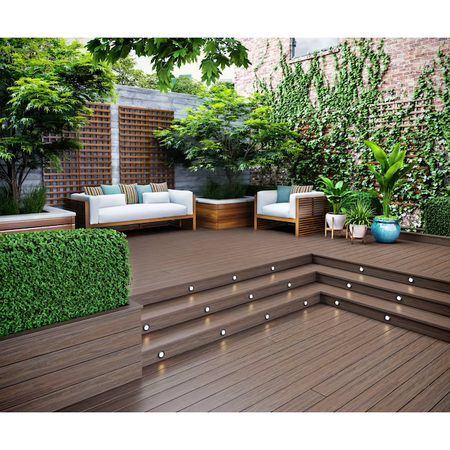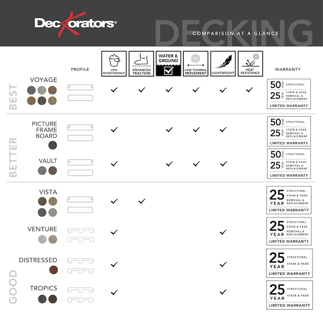 Las tarimas para terraza de la marca Deckorators aportan estilo y funcionalidad a su terraza o porche. Esta tarima compuesta de color marrón Hana tiene un perfil de borde ranurado y mide 1 pulgada de espesor por 5,5 pulgadas de ancho por 16 pies de largo. Las tablas de terraza Deckorators Tropics también tienen bastante relieve que reduce la cantidad de deslizamiento cuando están mojadas. Estas tablas también presentan un diseño de vetas de madera.