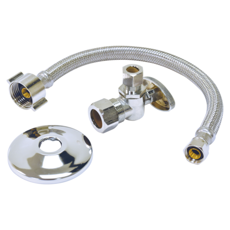 - Incluye: 1) Línea de suministro de agua de 12 pulgadas con conexión de tuerca esférica FIP de 3/8 pulgadas x 7/8 pulgadas, (1) válvula de cierre en ángulo de 1/4 de vuelta de 5/8 pulgadas de diámetro exterior x 3/8 pulgadas. Conexión OD, (1) brida de agarre seguro de 5/8 pulg. OD