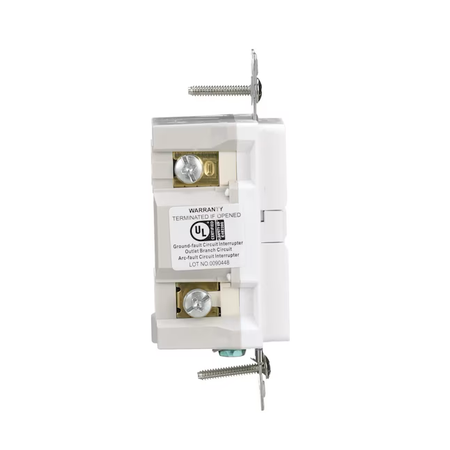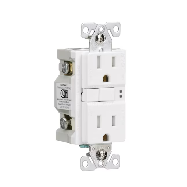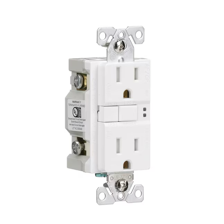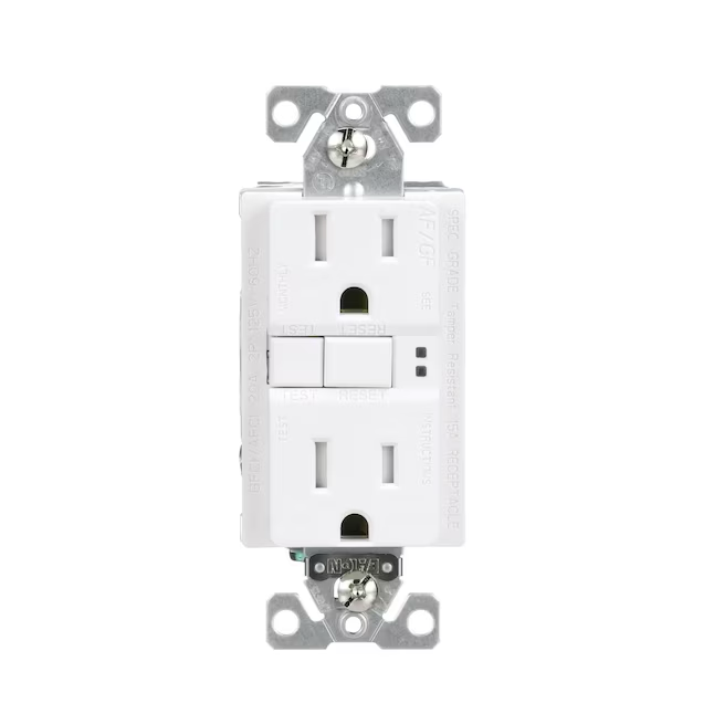 • El receptáculo TR AFCI/GFCI con acabado blanco ofrece una capacidad de 15 amperios y 125 voltios para uso en interiores a largo plazo.