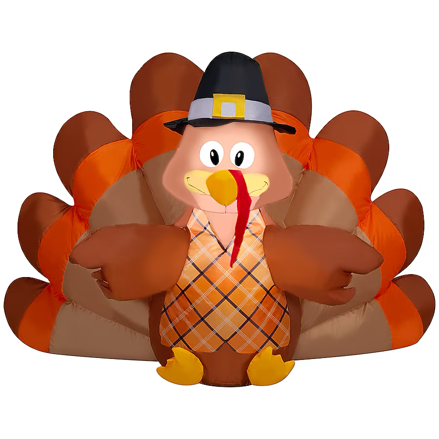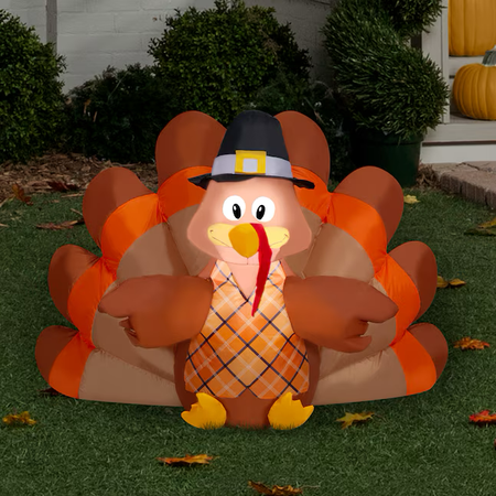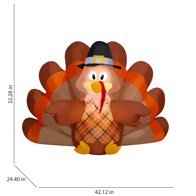 PAVO INFLABLE DE ACCIÓN DE GRACIAS: Pavo inflable Airblown® de 3,6 pies de ancho x 2,8 pies de alto x 2 pies de profundidad con sombrero de peregrino y chaleco con diseño de rombos