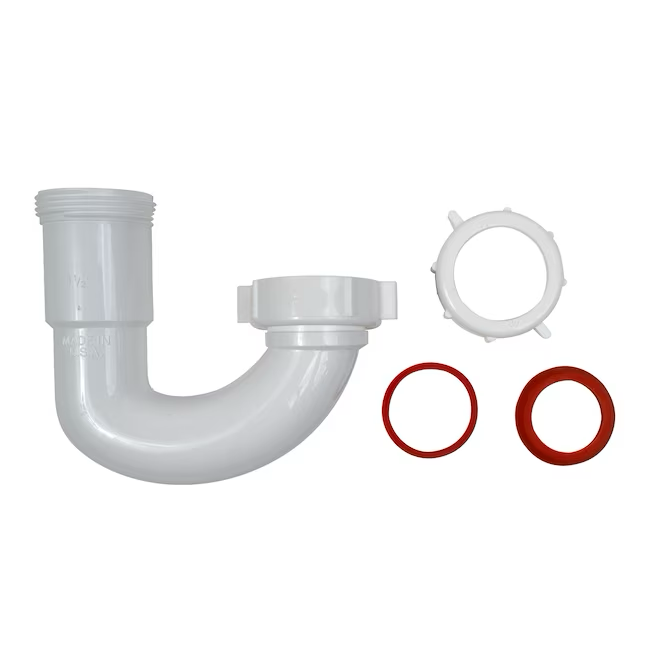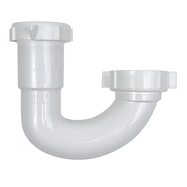 Sifón del fregadero con curva en J con tuerca capturada. Entrada de 1-1/2 pulgadas o 1-1/4 pulgadas y salida de 1-1/2 pulgadas.