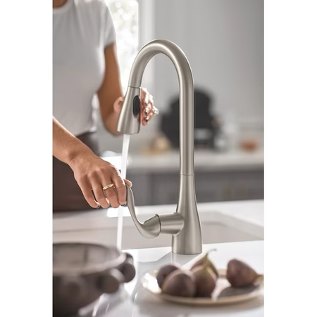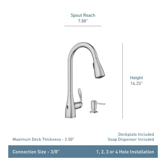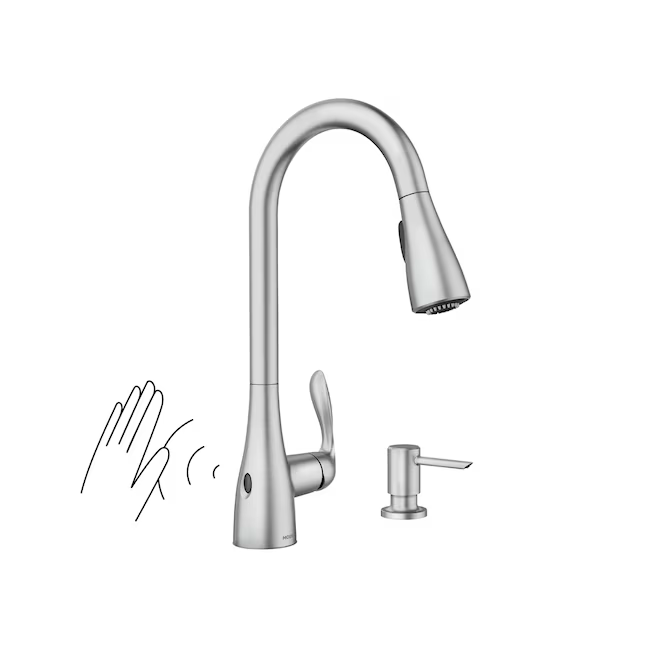 Moen Georgene Grifo de cocina sin contacto, de acero inoxidable, resistente a manchas, con una sola manija, abatible, con placa para cubierta y dispensador de jabón incluidos