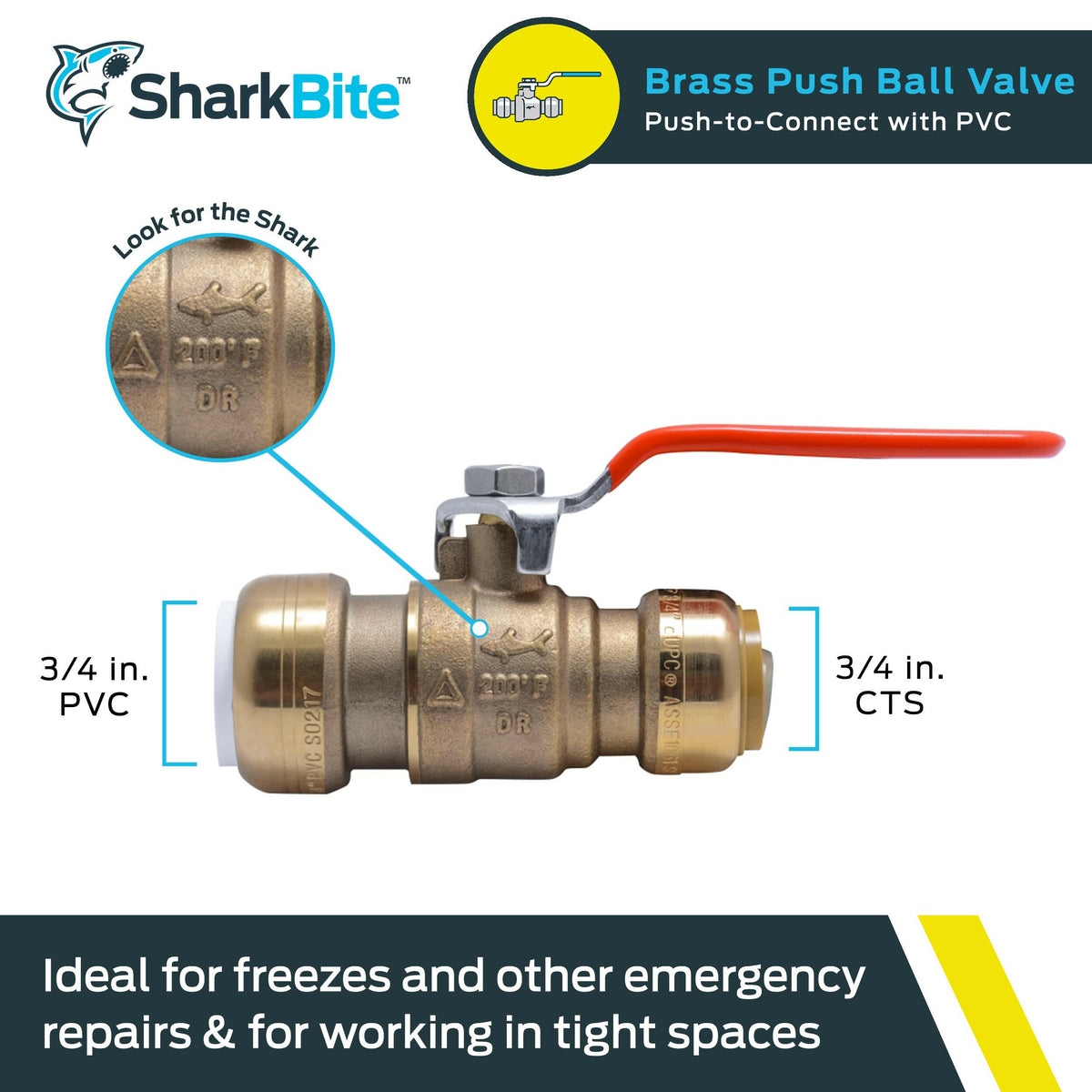 SharkBite Válvula de bola de latón CTS de 3/4 pulg. de PVC IPS de empuje para conectar x 3/4 pulg.