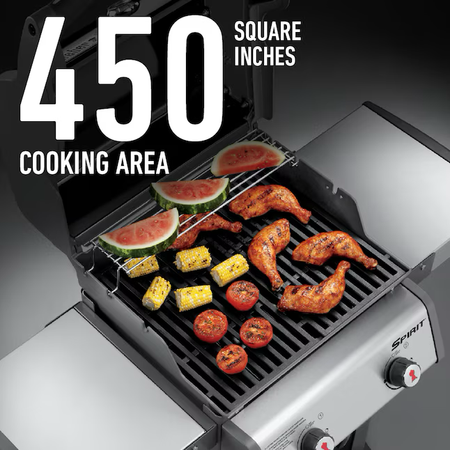 450 pulgadas cuadradas de área de cocción total ofrecen mucho espacio para asar, 360 pulgadas cuadradas de área de cocción principal y 90 pulgadas cuadradas de área de rejilla para calentar