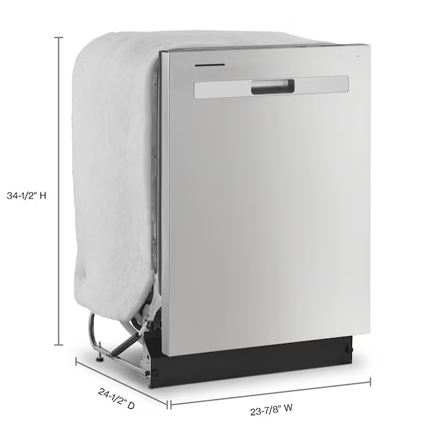 - Dimensions Profundidad real sin incluir el mango (pulgadas) 24,5 Tamaño común de lavavajillas 24 pulgadas Profundidad real incluyendo mango (pulgadas) 24.6 Altura máxima ensamblada (pulgadas) 34,5 Profundidad real con la puerta abierta (pulgadas) 49,5 Altura mínima ensamblada (pulgadas) 33,5 Ancho real (pulgadas) 23.875 Altura de la tina Alto Altura ajustable No