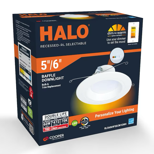 Halo Item # 21223284 | Model # RL56LS9FSD2W1EWHHALO Retrofit Luz empotrable LED regulable redonda conmutable de 5 o 6 pulgadas, color blanco mate, 1355 lúmenes
