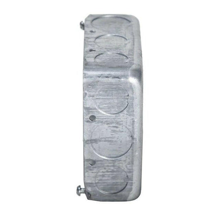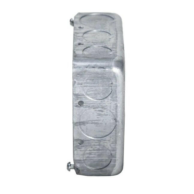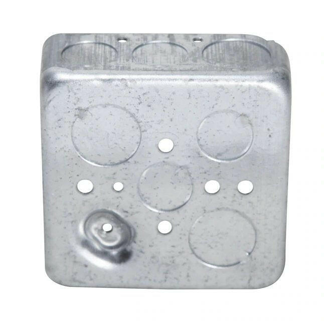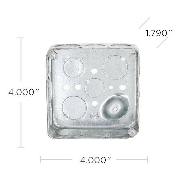 4 pulgadas La caja cuadrada dibujada se instala en techos o paredes para accesorios de iluminación, interruptores o receptáculos. Las cajas dibujadas son ideales para aplicaciones de trabajo expuestas. Las cajas cuadradas se utilizan cuando varios conductores se dividen en dos o más direcciones para llevar energía a varios dispositivos eléctricos. La capacidad de la caja es de 21,0 pulgadas cúbicas.