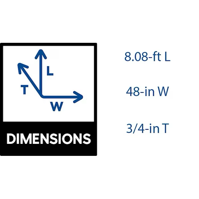 - Dimensions Longitud real (pies) 8.08 Medida común (ancho x largo) 4 pies x 8 pies Grosor real (pulgadas) 0,75 Medición de espesor común 3/4 pulg. Ancho real (pies) 4 Medición de ancho común 4 pies Medición de longitud común 8 pies