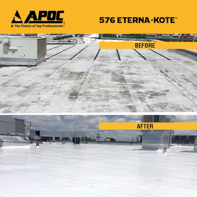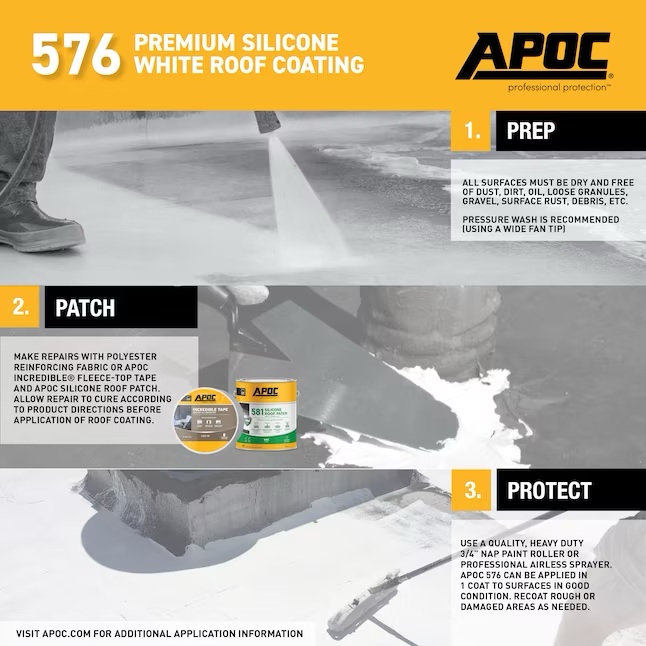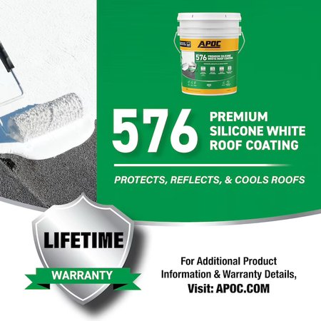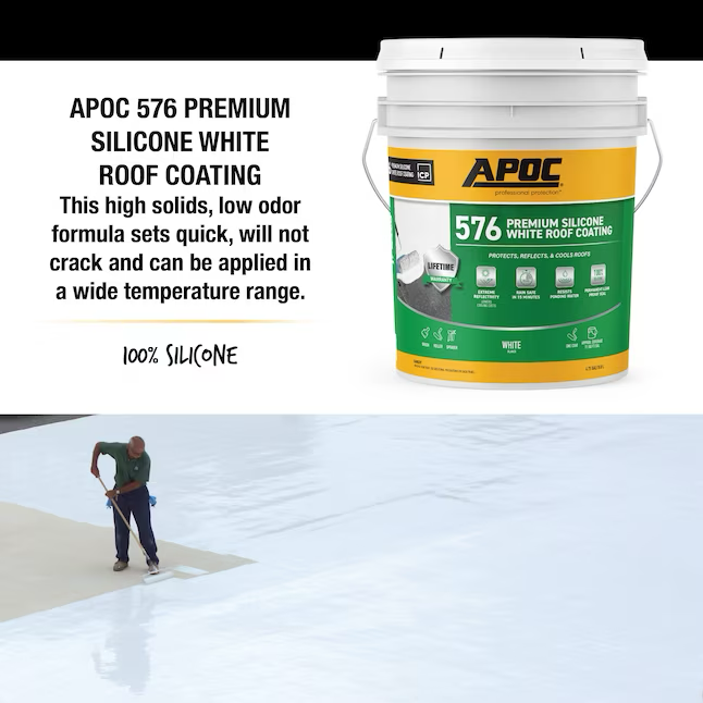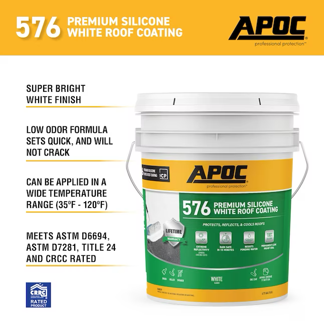 El revestimiento de silicona premium para techos APOC 576 de color blanco es un revestimiento para techos extremadamente reflectante, 100% silicona, para techos con pendiente baja o áreas donde puede ocurrir agua estancada. La fórmula con alto contenido de sólidos y bajo olor fragua rápidamente, no se agrieta y se puede aplicar en un amplio rango de temperaturas. No se necesitan equipos costosos. Aplicar con brocha, rodillo o pulverizador. APOC 576 supera los requisitos de rendimiento de ASTM D6694, ASTM D7281, Título 24 y clasificación CRCC.