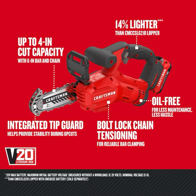 Trae las ramas. La motosierra de poda inalámbrica V20* viene equipada con una batería de 2,0 Ah y tiene una potencia de corte óptima para realizar hasta 85 cortes por carga. Con 6 pulgadas. barra y cadena, tiene una capacidad de corte de hasta 4 pulgadas. para hacer el trabajo. Con un 50% más compacto y un 14% más liviano que el CMCCSL621B, tiene facilidad de uso y maniobrabilidad. El protector de punta integrado es una gran característica y está diseñado para ayudar a proporcionar control sobre los cortes superiores. La plataforma de batería V20* es compatible con los equipos y herramientas eléctricas para exteriores CRAFTSMAN® V20*. Encontrará la línea completa de herramientas y equipos para exteriores esenciales para un trabajo del que se sienta orgulloso.