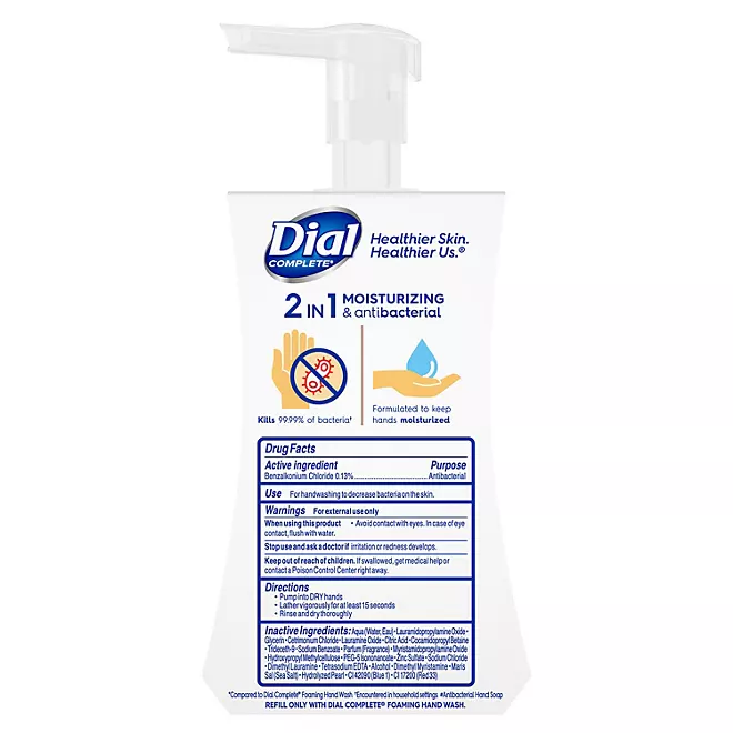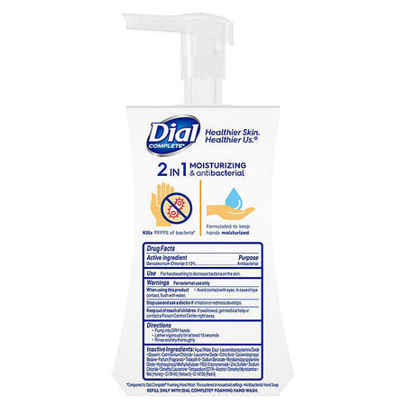 La fórmula antibacteriana e hidratante 2 en 1 contiene el doble de ingredientes hidratantes y mata el 99,99 por ciento de las bacterias que puede encontrar en el hogar. Este jabón de manos en espuma Dial Complete(R) es resistente a las bacterias. La espuma rica y cremosa ayuda a mantener la humedad de la piel proporcionando una hidratación ligera para una sensación suave. Su lujosa espuma se puede utilizar incluso en el rostro y el cuerpo.