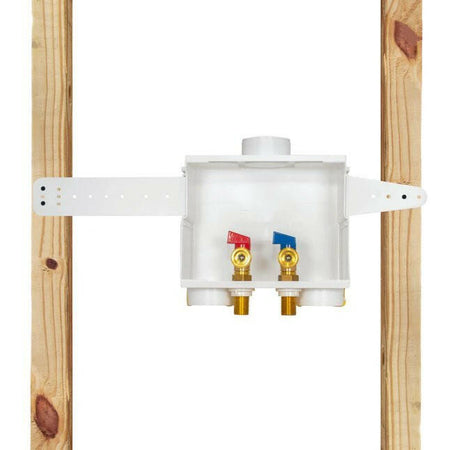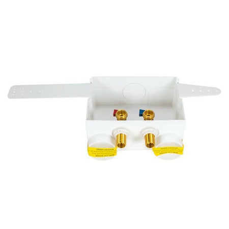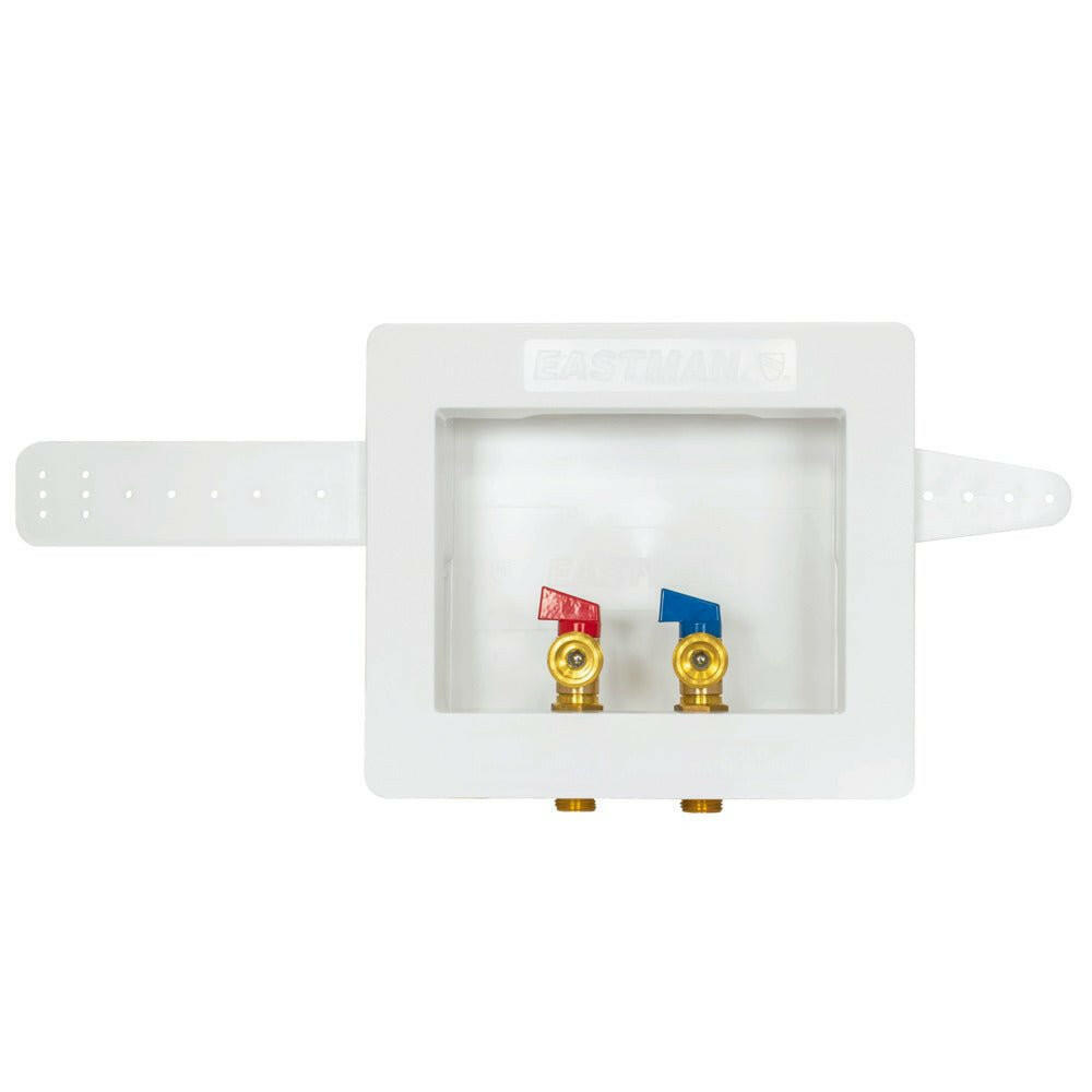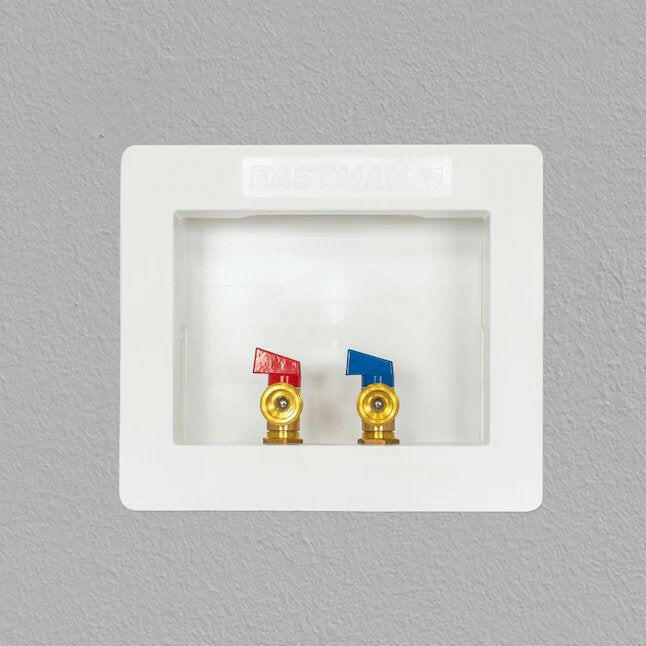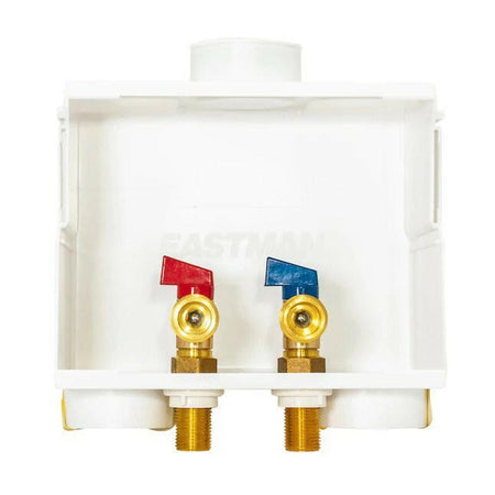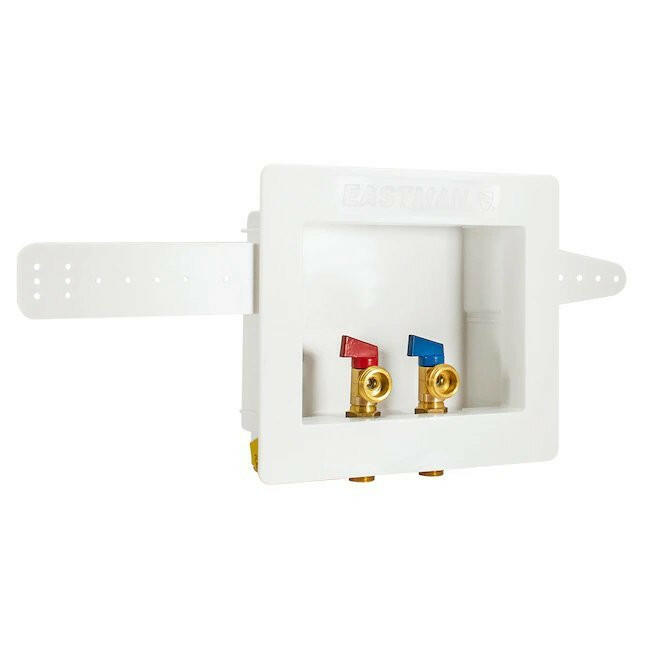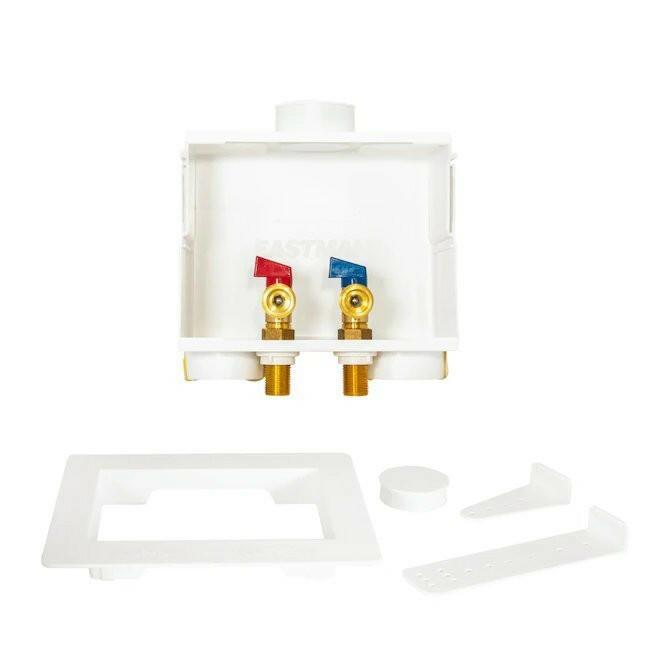 La caja de salida de la lavadora Eastman® proporciona una instalación de suministro de agua segura para las lavadoras. Es una caja de una sola pieza construida con plástico no corrosivo de alto impacto. Tiene un diseño empotrado que se adapta a paneles de yeso de 1 pulgada. Viene con un soporte de soporte preinstalado, una cubierta de placa frontal y válvulas de bola fría y caliente de 1/4 de vuelta para cierre durante el mantenimiento. Esta caja de salida para lavadora tiene una conexión de entrada de sudor de 1/2 pulgada y una salida de rosca macho para manguera de 3/4 de pulgada. Está diseñado para aplicaciones residenciales. Aprobado por la UPC.