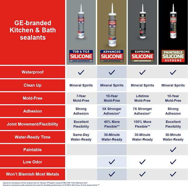 De la marca de silicona número uno, el sellador para baños y cocinas GE Advanced Silicone 2 es un sellador de alto rendimiento, 100% silicona y 100% impermeable, ideal para áreas propensas a la exposición al agua. El sellador Advanced Silicone 2 para cocina y baño es permanentemente flexible con un 40% más de flexibilidad que los selladores Clase 25 y tiene una adhesión 5 veces más fuerte que el sellador GE Silicone 1. Su fórmula lista para agua de 30 minutos ofrece una protección del producto libre de moho durante 10 años para proteger contra el crecimiento de moho y hongos. Respaldado por una garantía de por vida. Se adhiere a: la mayoría de los metales, plásticos y maderas, vidrio, paneles de yeso, yeso, granito, mármol cultivado, baldosas de cerámica y porcelana, piedra natural, tableros de cemento, compuestos, fórmica, fibra de vidrio, aluminio y superficies pintadas.