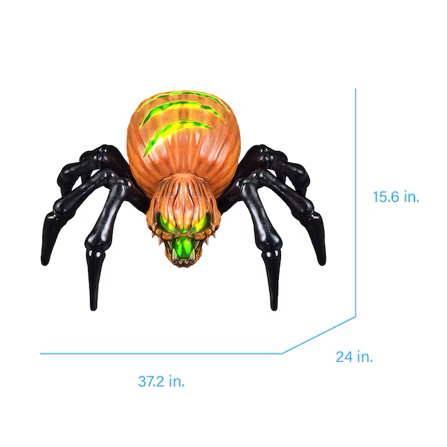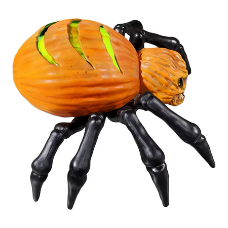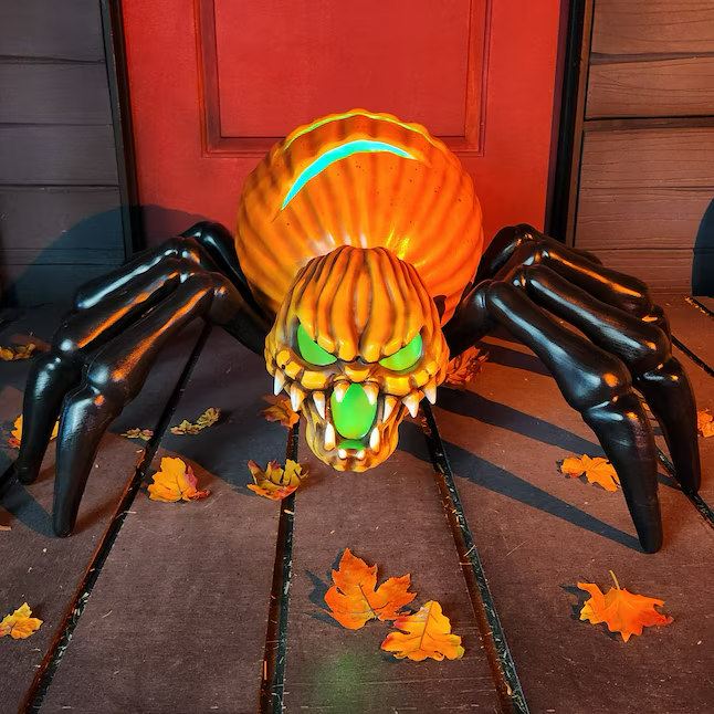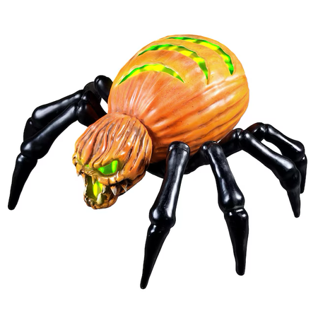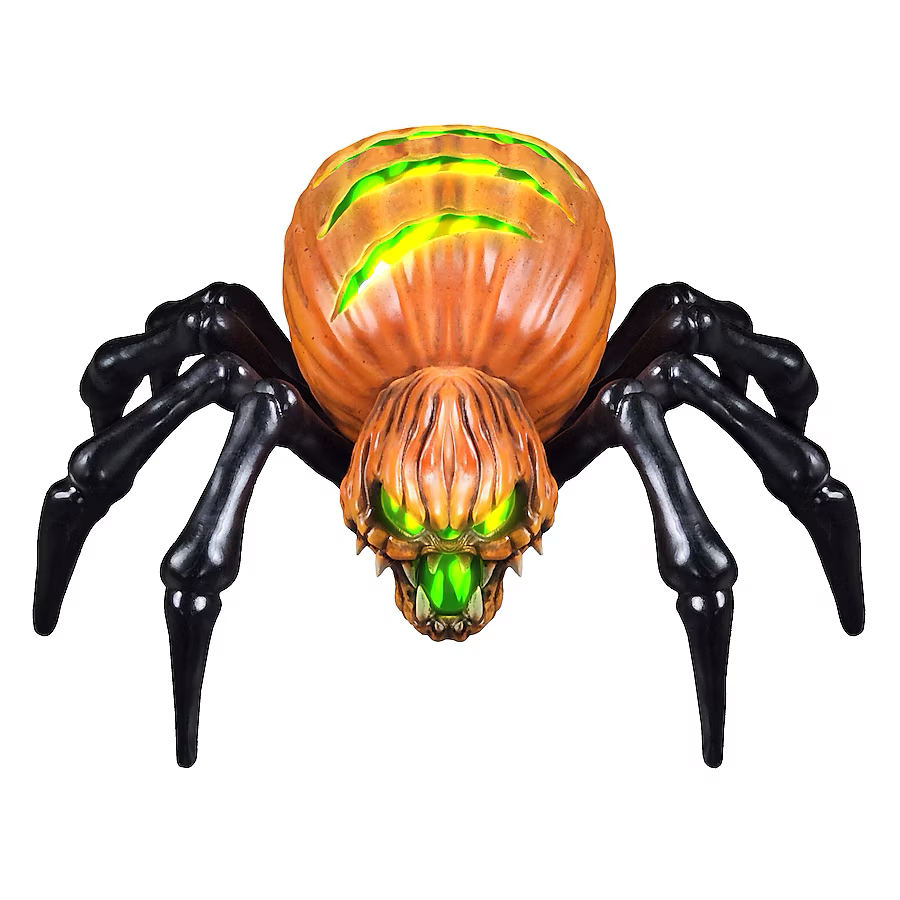 ¡Esta aterradora araña gigante con caparazón de calabaza agrietado ilumina la noche con sus fantasmales llamas LED verdes parpadeantes!