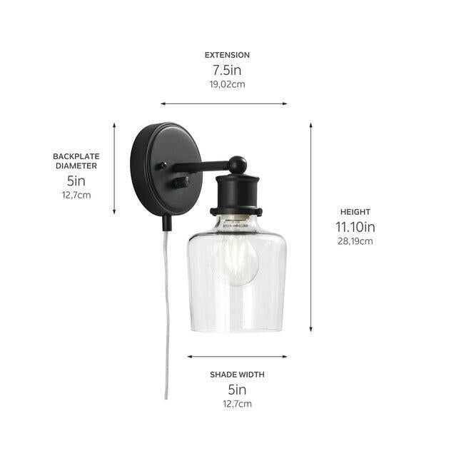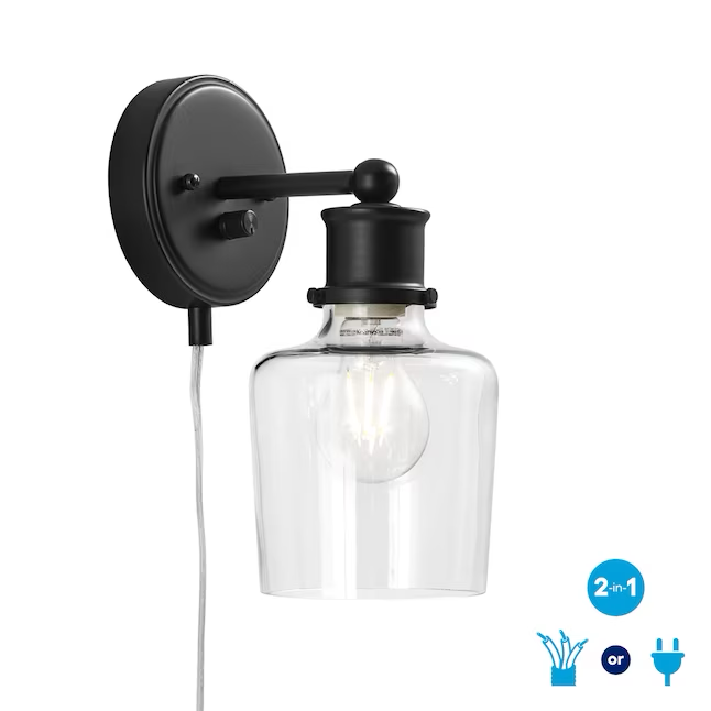 Cree una apariencia que no sea ordinaria con el aplique de pared enchufable Helen 1 Light. Con detalles suaves e industriales que añaden matices a su estilo tradicional actualizado, la colección Helen crea una sensación que siempre estará de moda. El acabado negro mate contrasta con su pantalla de cristal transparente para iluminar y deleitar. El sueño de todo aficionado al bricolaje: las luces de pared enchufables hacen que la instalación sea tan fácil como colgar un cuadro en la pared. Sólo necesitas algunas herramientas y un enchufe; Es tan simple como eso. La opción de enchufar la luz facilita la actualización de varios lugares de una casa, condominio o apartamento. Agregue una apariencia cautivadora a un pasillo, entrada, a ambos lados de una mesa de buffet o dele vida a su cocina. Además, la conveniente ubicación del interruptor de encendido/apagado en la placa posterior ofrece accesibilidad y facilidad de uso. Este aplique de pared enchufable aportará estilo y comodidad a su hogar.