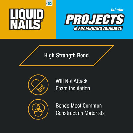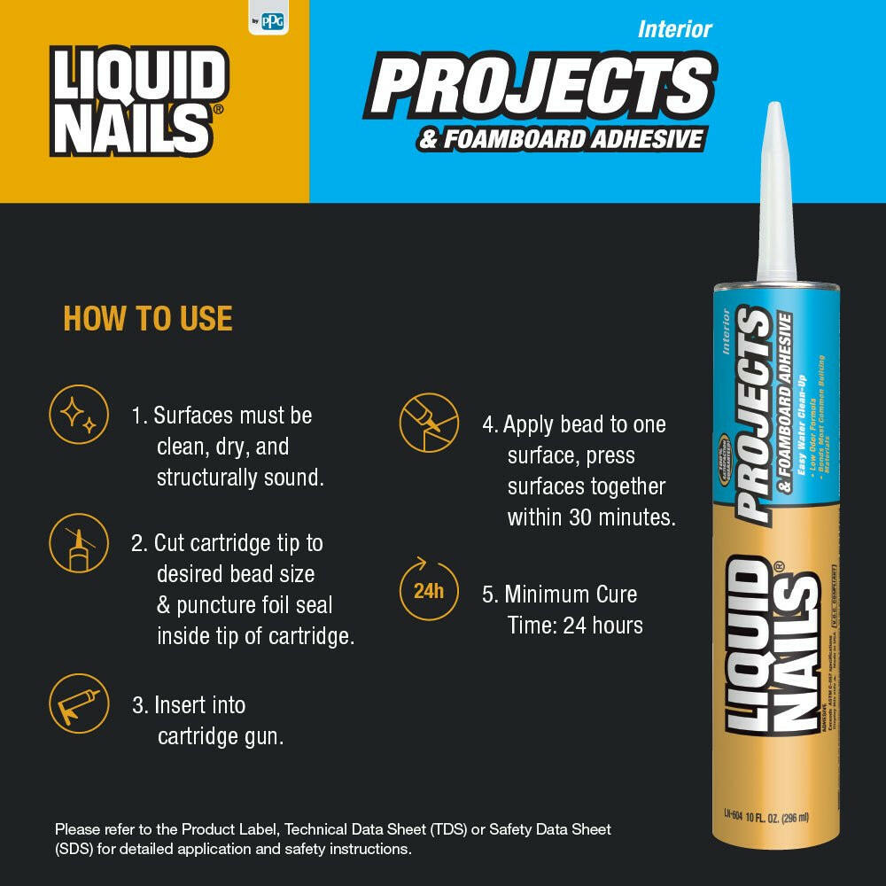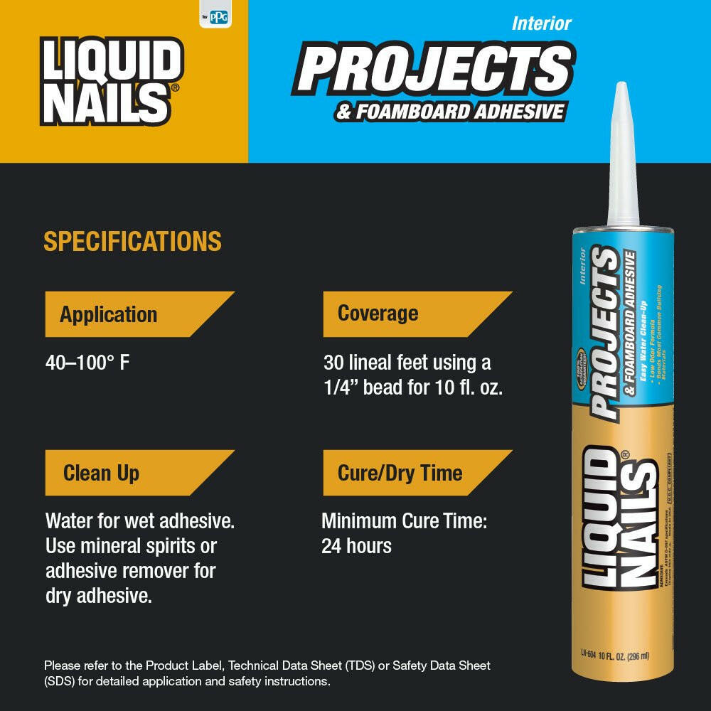 Liquid Nails Interior Projects & Foamboard Adhesive (LN-604) ofrece una adhesión de unión de alta resistencia incluso en condiciones extremas. Viene en un tubo de plástico duradero para almacenamiento durante todo el año en cualquier clima.