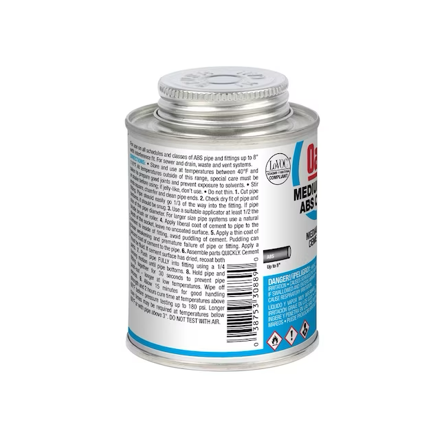 Se recomienda el cemento negro de fraguado rápido y cuerpo medio ABS Oatey® para todas las aplicaciones sin presión. El color negro identifica fácilmente la aplicación a la superficie de la tubería. Su cuerpo medio tiene excelentes propiedades para rellenar huecos y es fácil de aplicar con el pincel incluido en la tapa. Este cemento de fraguado rápido se puede utilizar para soldar con solvente todos los tipos y clases de tuberías y accesorios de ABS de hasta 6 pulgadas de diámetro con ajuste de interferencia. El tiempo de fraguado es de unos 30 minutos. Los productos Oatey se han ganado la confianza de los profesionales de plomería durante más de 100 años.