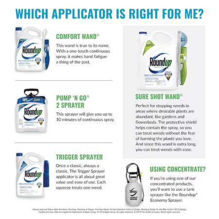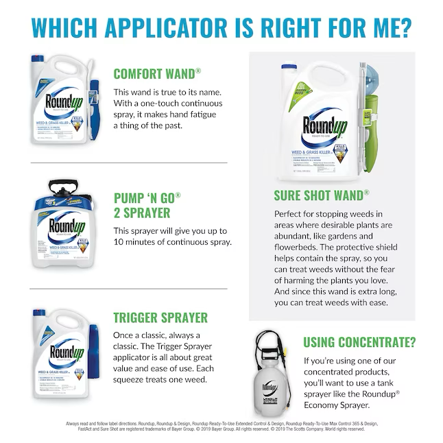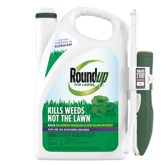 Roundup for Lawns4 es una fórmula diseñada específicamente para pastos del sur que mata las malezas, ¡no el césped! Controla más de 90 malezas comunes del césped, con raíces y todo, y funciona rápidamente con malezas difíciles de matar, como la hierba dólar, el diente de león, el trébol y el coquillo amarillo. Se puede utilizar con confianza incluso en los pastos más delicados del sur, como Floratam y Centipede. Esta fórmula lista para usar con nuestra nueva varita extendida hace que sea más fácil que nunca tratar las malas hierbas del césped, ¡sin tener que agacharse! Todo lo que necesitas es una botella para tratar hasta 2000 malas hierbas. Esta fórmula de acción rápida mata al contacto y destruye las malas hierbas hasta la raíz para que no vuelvan a aparecer. Además, ¡es resistente a la lluvia en tan solo 4 horas! Roundup for Lawns4 es un paso sencillo hacia un césped hermoso y libre de malezas. Roundup for Lawns4 funciona muy bien en su césped, e incluso mejor en combinación con Roundup Weed & Grass Killer Concentrate, además de eliminar las malas hierbas en áreas sin césped, como aceras, patios, caminos de acceso y parterres de jardín, para opciones de eliminación de malezas en toda su casa. .